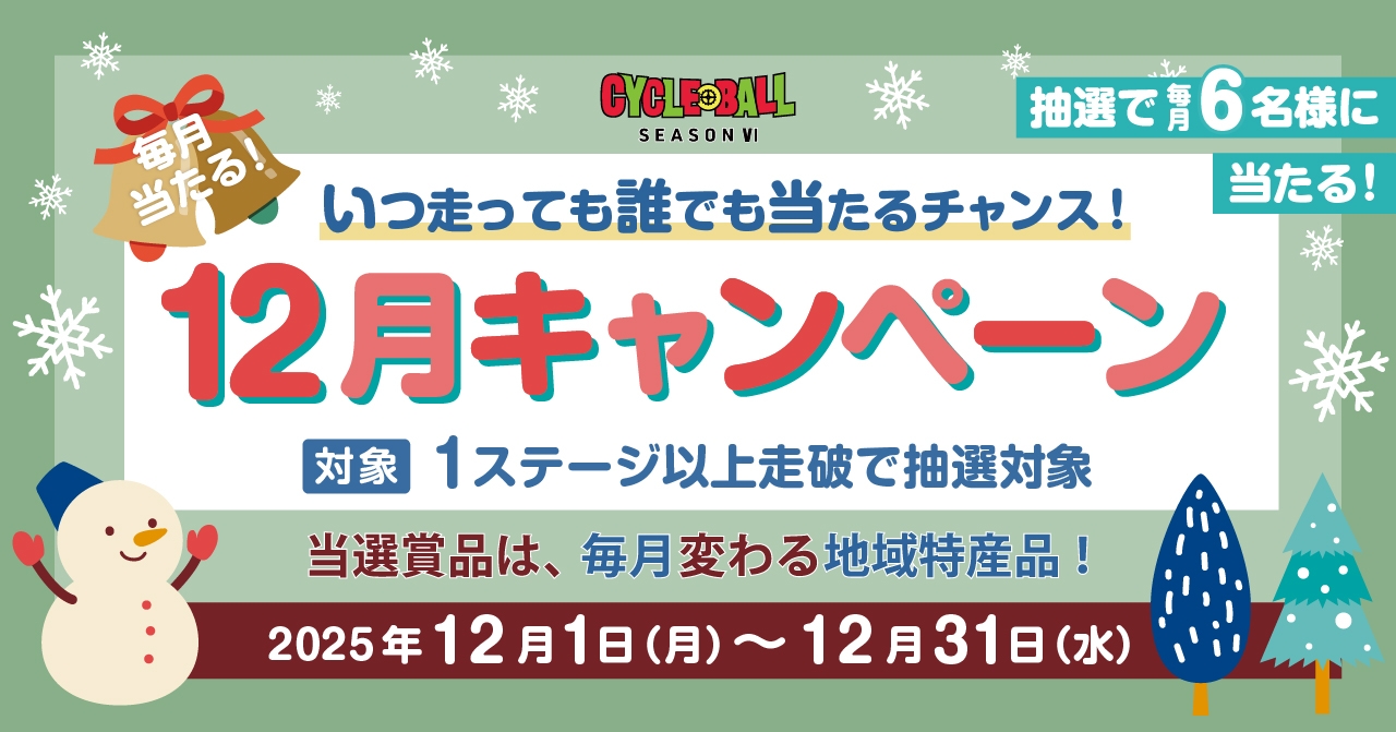 いつ走っても、誰にでも当選チャンスがある毎月キャンペーンをシーズン終了まで実施します!当選賞品は、毎月抽選で6名様に【地域特産品】をプレゼント!応募条件は、1ステージ以上走破のみ。月替わりで開催ステージの地域にゆかりある賞品をご用意予定です。お楽しみに!