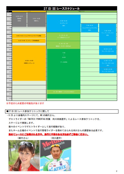 - 参加者の方々には自身に合ったレベル、趣旨のイベント(レース、サイクリング等)に参加していただく