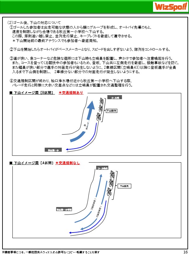 →ヘルメット、グローブ装備、キープレフト(またはライト)の徹底、コース上の危険個所、走行中参加者同士の声掛け