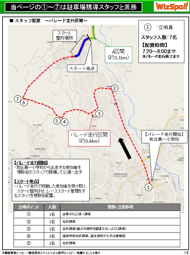 ・1周3.2kmの広い公園内を走る周回レースの場合:コース上に3名の注意喚起スタッフを配置*導入実績