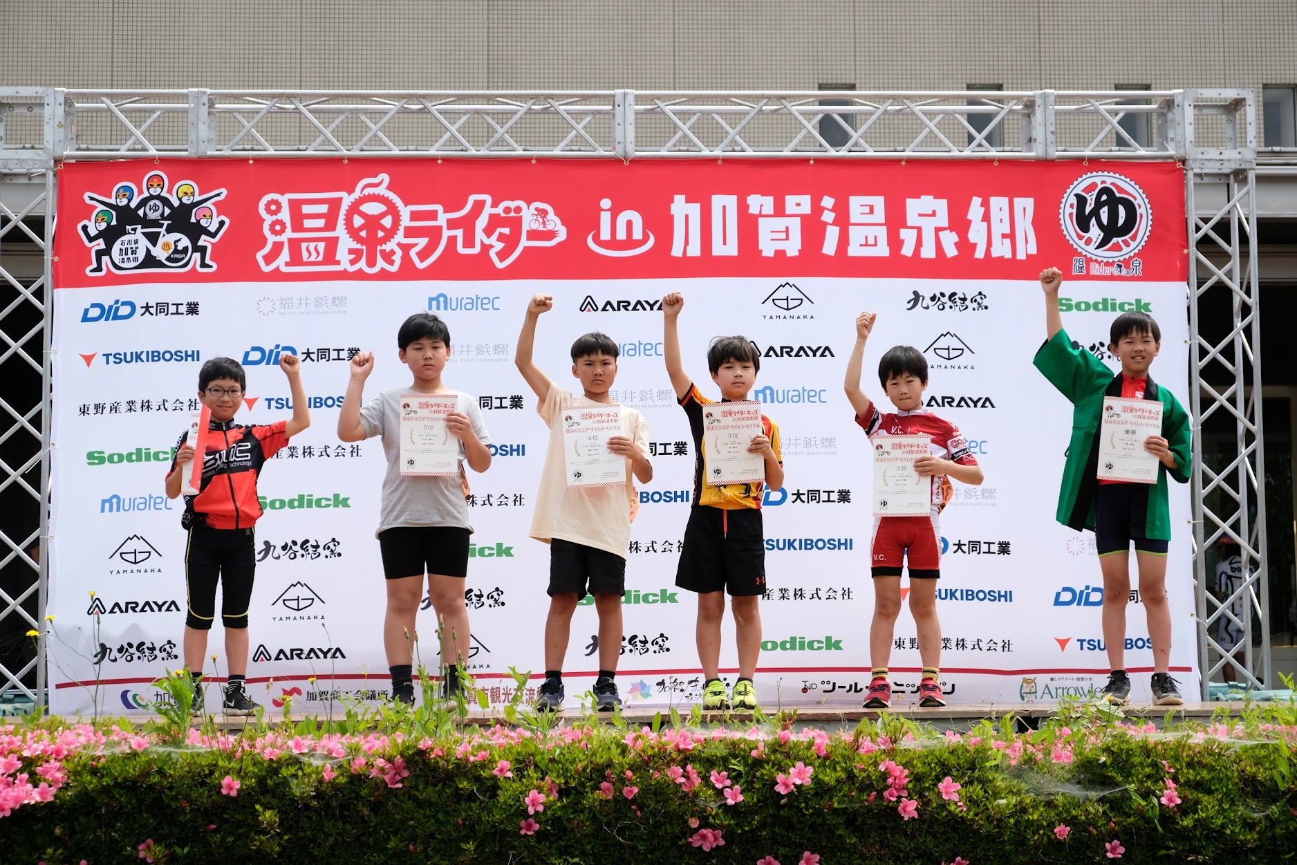 上位6名の表彰式!各カテゴリーの優勝者には大人同様、温泉ライダー特製・緑の「半纏ジョーヌ」が贈られました。